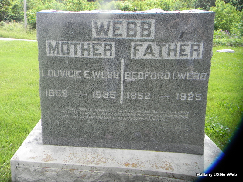 SSW: Louvicie E.- Research Note: Bedford is listed as Bedford Issah Webb and as born in Bedford Co., TN. His father is given as Stephen A. Webb, born Bedford Co., TN and his mother as Eliza Prudence Murphy, born Bedford Co., TN. He was a farmer and the cause of death was listed as cancer of the liver. - July 11, 1903, Saturday, Cassville Democrat - Rocky Comfort Guide: John Webb, of Oklahoma, a brother of our townsman, B. I. Webb, visited relatives in the vicinity, this week. - May 27, 1905, Saturday, Cassville Democrat - Rocky Comfort Telegrams: B. I. Webb visited his mother at Pea Ridge, Arkansas, Miss Pruda Webb, who had been visiting there accompanied him home. - Cassville Republican, Thursday, May 30, 1918 - Rocky Comfort: Mr. and Mrs. B. A. Howard of near Fairview visited the latter's parents, Mr. and Mrs. B. I. Webb, here Sunday. Another Photo - Another Photo - Back of Stone | Death Certificate Donna Cooper Online Newspapers Phyllis Long Photo Jay Trace Photos Bill Utter |