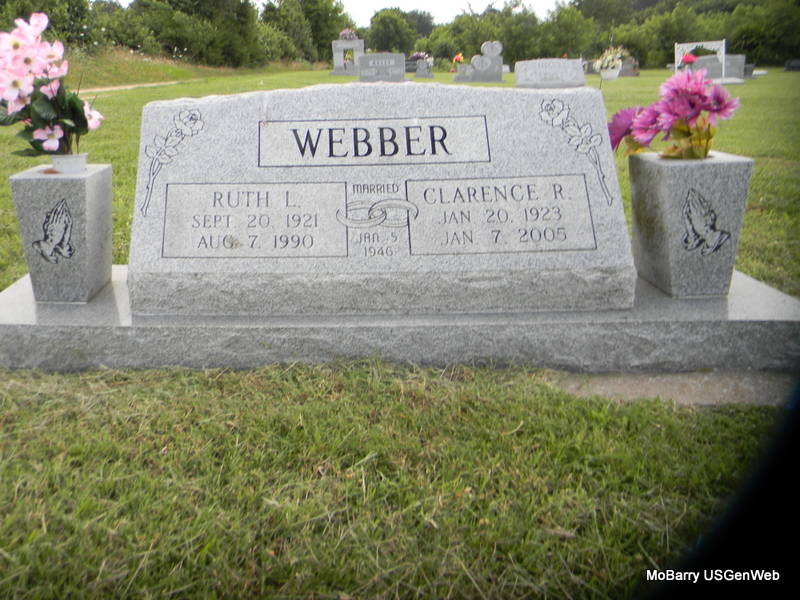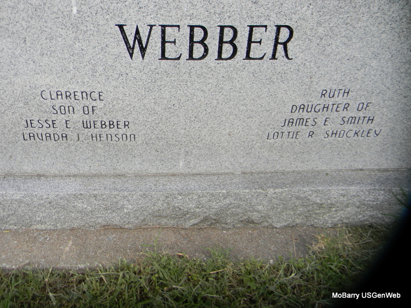 SSW: Ruth L. - Inscription: "Married Jan. 5, 1946" - Research Note: Son of Jesse Earl Webber and Lavada Jane Henson. He attended Lone Hill School near Verona. He was a self-employed finish carpenter, retiring in 1994. He moved to Grove, Oklahoma in 1976. He married Ruth L. Smith on June 5, 1946, in Columbus, Kansas, and she preceded him in death in 1990. He was preceded in death by one brother, Arthur Webber, and two infant brothers. - Back of Stone | Monett Times Phyllis Long Photo Bill Utter |