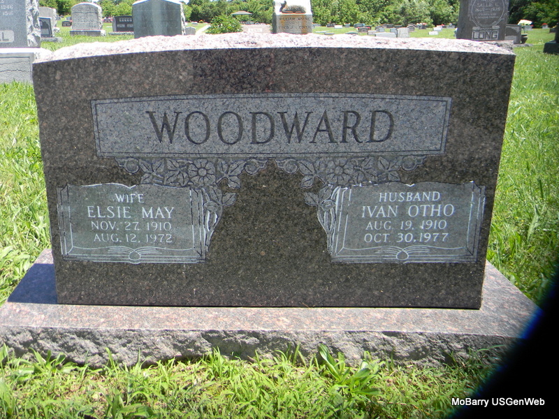 SSW: Elsie May - Research Note: Son of James Andrew Woodward and Essa M. Reed. - Services for Otho Woodward, 67, Roseville, formerly of Exeter, who died at 11 pm Sunday, October 30 at a Roseville hospital after a short illness, will be at 2 pm Friday at the Williamson Funeral Home, Cassville. Rev. Jess Higgs will officiate. Burial will be at Rocky Comfort Cemetery. The family will receive friends from 7 to 8:30 pm Thursday at the funeral home, and will be at the home of J. C. Duncan, Cassville. Mr. Woodward was born August 19, 1910 at Exeter. He was a farmer in the Exeter area, moving to CA, 20 years ago. He was employed there by the Southern Pacific Railroad. He was a member of the Methodist Church. Surviving is his wife, Mrs. Elsie Woodward of the home, and a sister, Mrs. Willow Fern Elbert, Elko. NV. | Bible Cheryl Online Obit Census Phyllis Long Photo Bill Utter |