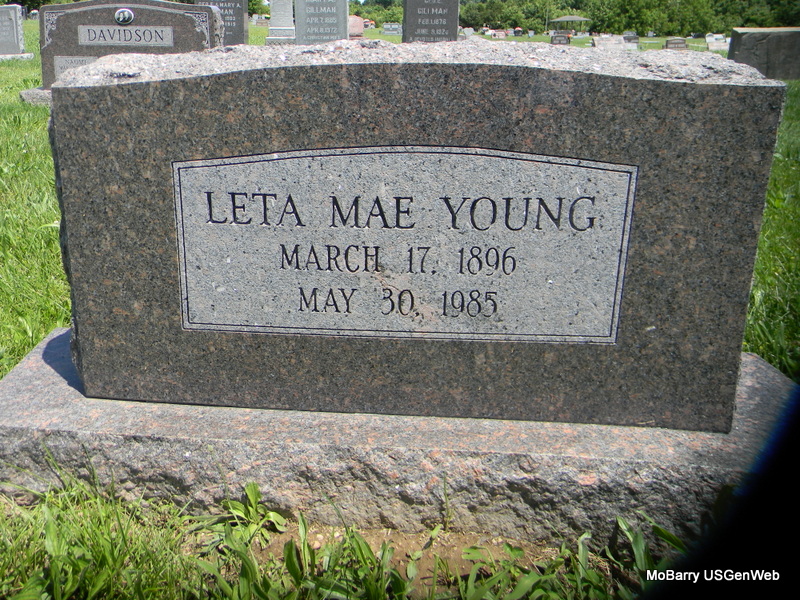 | YOUNG, Leta Mae (DAVIDSON) | Mar. 17, 1896 | May 30, 1985 | Research Note: Daughter of Ulysses Sheridan Davidson and Cumi Duncan, both buried at Rocky Comfort Cemetery. Buried next to William Alfred Young. Alfred Young married Leta Davidson on Apr. 15, 1918 in McDonald Co., MO. | Census MO Marriage Records Phyllis Long Photo Bill Utter |