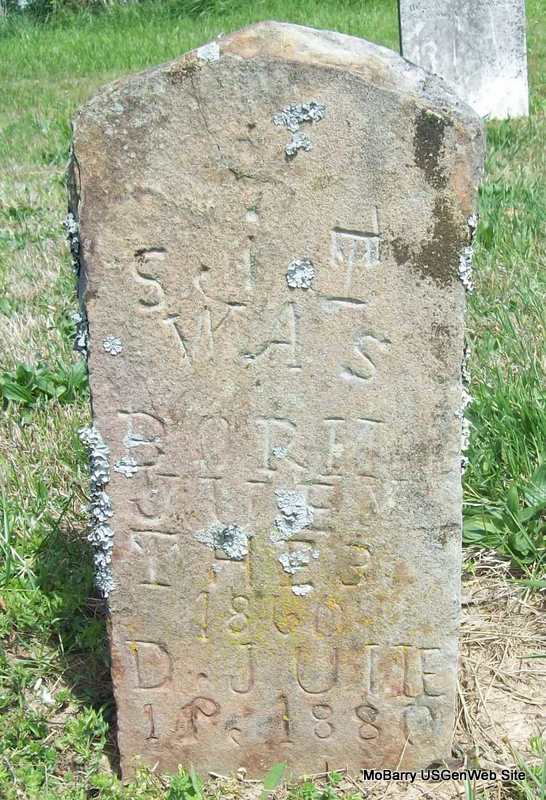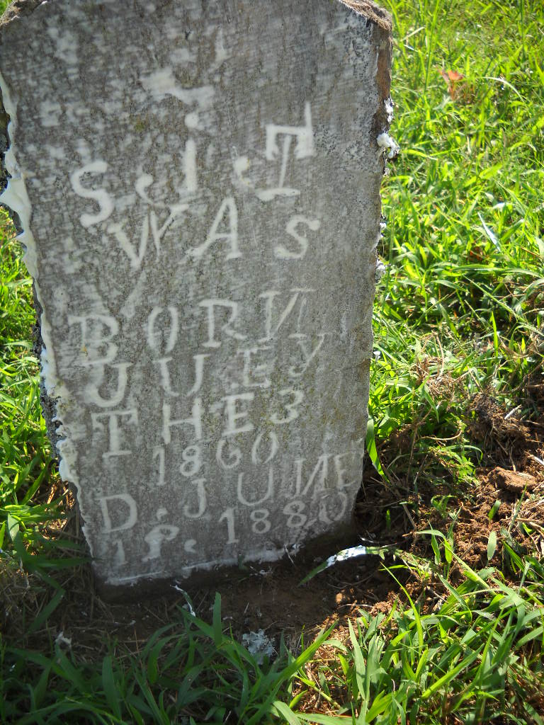 Inscription: "S. j. T. was born Juey the 3 1860 D. June 19, 1880" - Research Note: On this homemade, sandstone, marker, Some of the letters are backwards. Sarah was a daughter of Edward A. and Marilla (Shipley) Tate. In 1860 she was listed as age 1 on the census. The Tate family researchers have her birth year as 1859 and the death date, July 1, 1880, which is a little different from what the stone has inscribed on it. In 1880 Sarah was living at home and age 21, listed as having convulsions. - Photo Retake | Photo Wilma Fields Note Donna Cooper Retake Photo Donna Cooper Ted Roller |