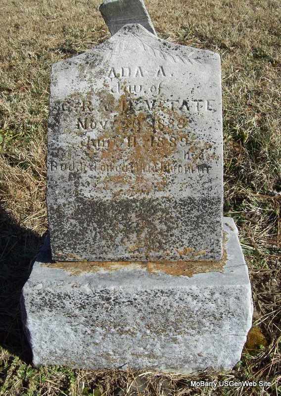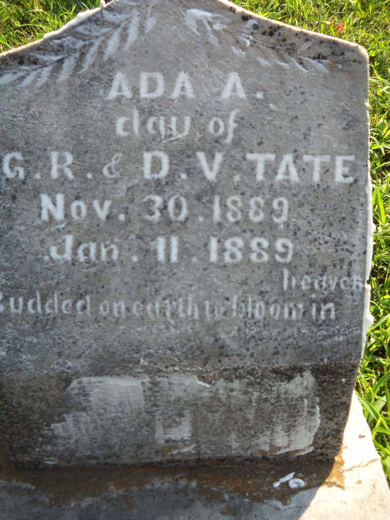 | TATE, Ada A. | Nov. 20, 1888 | Jan. 11, 1889 | Inscription: "Dau. of G. R. and D. V. Tate - Budded on Earth to Bloom in Heaven " - Research Note: This stone has Nov. 20, 1889 as the birth date, which is a date after she died in Jan. of 1889. Daughter of Grusham R. Tate and Dora Beaver. - Retake Photo | Photo Wilma Fields Note Retake Photo Donna Cooper Ted Roller |