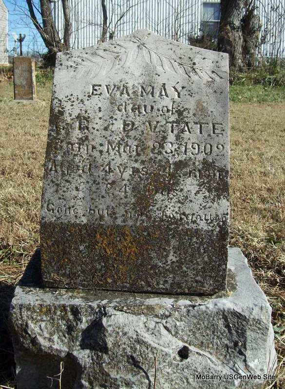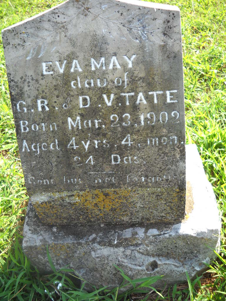 Inscription: "Dau. of G. R. and D. V. Tate - Aged 4 Yrs. 4 Mon. 24 Ds. - Gone but not forgotten" - Research Note: In 1900 Eva May was listed in the household of Grusham and Dora Tate and was listed as born Nov. 1896 in AR which would be incorrect if she was 4 years old. Her stone reads that she was born Mar. 23, 1902. - Retake Photo | Photo Wilma Fields Note Donna Cooper Retake Photo Donna Cooper Ted Roller |