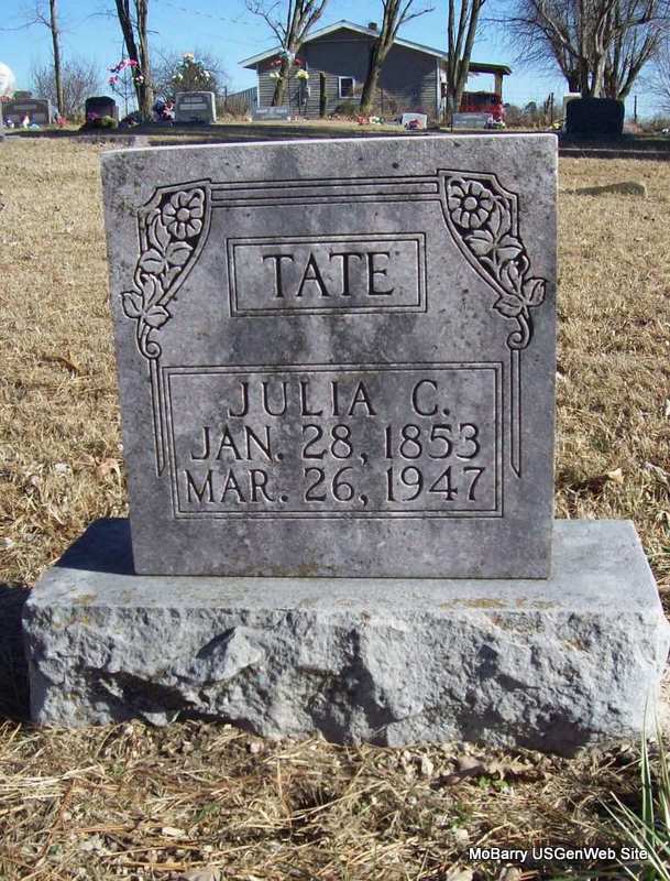 | TATE, Julia Catherine (ROBINETT) | Jan. 28, 1853 | Mar. 26, 1947 | Research Note: Elbert Jackson Tate was her husband's name - and they married in Barry Co., MO, on Feb. 17, 1880. Michael Jefferson and Mary Ann (Winiger) Robinett were her parents. | Photo Wilma Fields Note Donna Cooper |