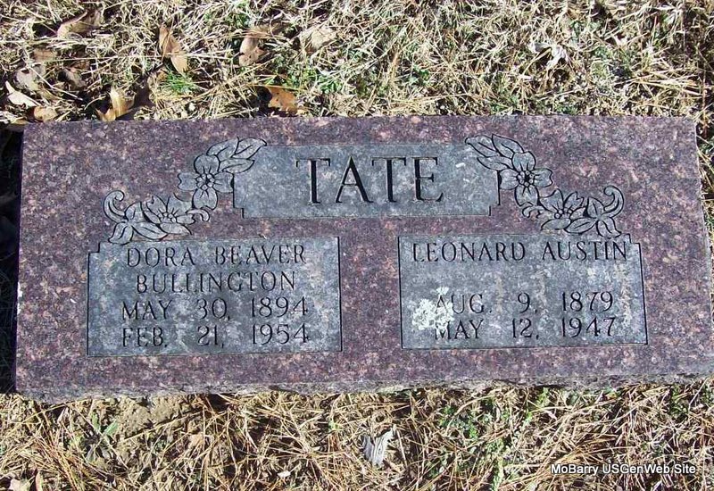| TATE, Dora Bell (BEAVER) (BULLINGTON) | May 30, 1894 | Feb. 21, 1954 | SSW: Leonard Austin - Research Note: Dora Beaver, age 17, married James William Bullington, age 27, on Nov. 17, 1911 in Carroll Co., AR. Married to Leonard A. Tate in the 1940 Census. Daughter of Allen Jefferson Beaver and Nancy Ann Davis. | Photo Wilma Fields SS Claims Index AR Marriage Index Census Phyllis Long |