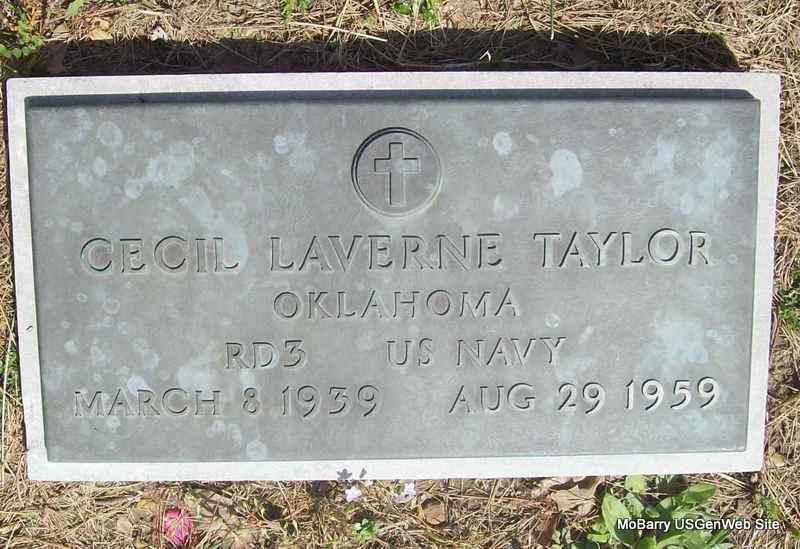 Inscription: "Oklahoma RD3 US Navy" - Research Note: Son of Lee Roy Taylor and Mildred Adeline Priest. His mother ordered the military head stone. He accidentally fell from a bridge piling into the James River. Official Navy Records, Washington D. C. was named as the informant. | Photo Wilma Fields VA Death Certificate Military Headstones Phyllis Long |