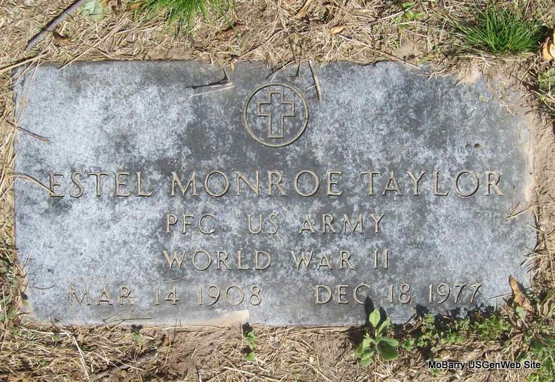 Inscription: "PFC US Army World War II" - Research Note: Estel was a son of James L. and Esteneth (Woodruff) Taylor. He was a brother of Neomia (Taylor) Tate. Estel Taylor, age 42, married Leonad May Ford, age 28, on July 27, 1950 in Benton Co., AR. Wilma's Note - Obit: Estel Monroe Taylor, 69, of Seligman, Mo., died Sunday at his home. He was born Mar. 14, 1908, at Monte Ne. He was a veteran of World War II and was a retired farmer. He is survived by his wife of the home; one daughter of Rogers; three brothers of Seligman, Rogers, and Farmington; two sisters of Garfield and Seligman. Services were at 2 p.m. today at Gateway Chapel. Burial was in the Roller Cemetery at Gateway under the direction of Axley's Culver Funeral Service of Cassville, Mo. | Note Photo Wilma Fields Note Donna Cooper AR Marriage Index Phyllis Long |