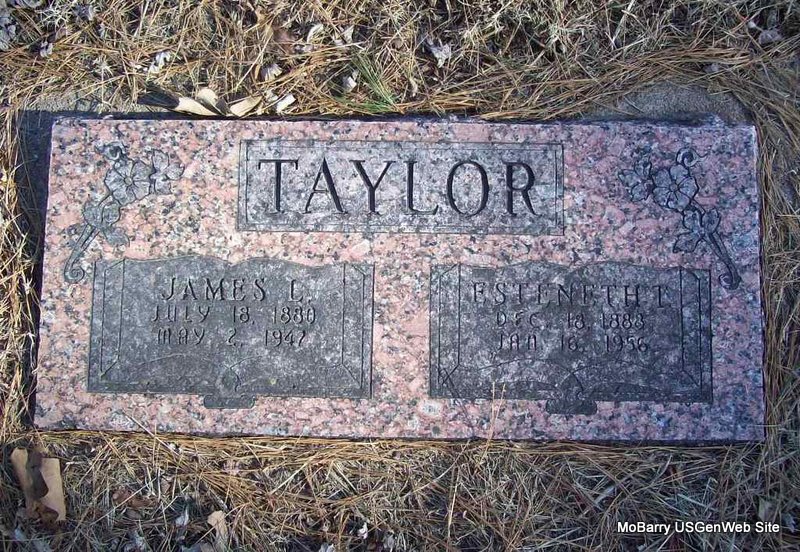 SSW: Esteneth T. - Research Note: He married Esteneth T. Woodruff. James and family were listed in 1930 at Esculapia, Benton, AR; Roll: 65; Page: 7B; Enumeration District: 19. - Vol. 2, page 64, T and Enterprise - James L. Taylor, R. R., Seligman, MO, was born in Barry Co., MO, died age 67 years. He was a son of James and Peggy Hutson [Hudson] Taylor. James was born in KY. He died at Cardwell Hospital, May 2, 1947, and was buried May 4, 1947 in Roller Cemetery. Funeral was at Roller Church. His closest relative was Esteneth Taylor of Seligman. - His death certificate gives almost the same information. Dallas Taylor was the informant. However, his death certificate has that he was born Mar. 16, 1880. | Photo Wilma Fields Census Note Culver's Funeral Home V. 2, P. 64 by Ted Roller Death Certificate Donna Cooper |
