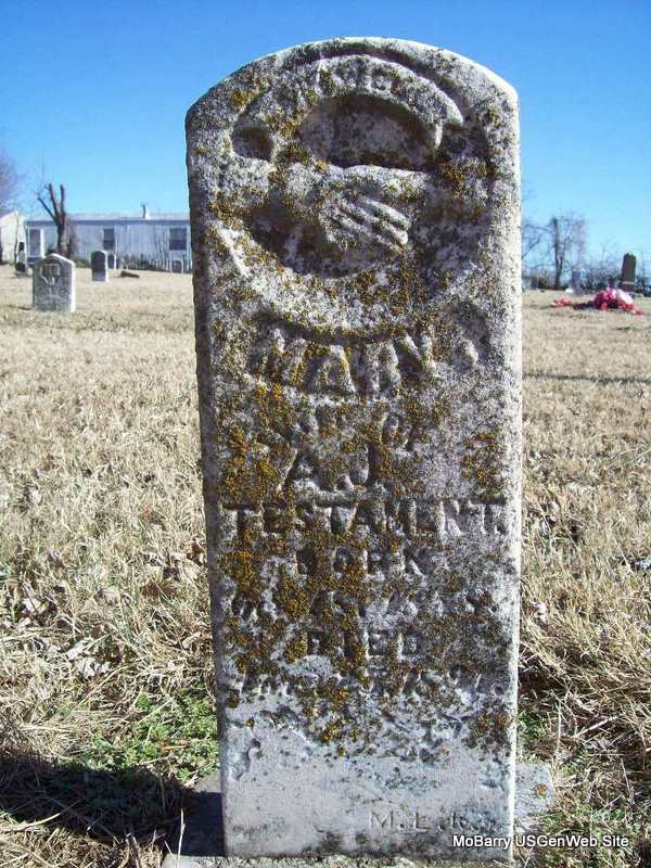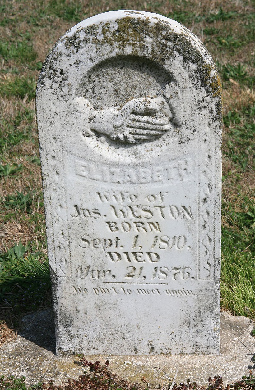 Mar. 21, 1876 | Inscription: "Wife of Jas. Weston" - "We Part to Meet Again" - Research Note: Researchers say she was the daughter of William Babb and Marcy Mary Brown. She married James Weston in Hawkins Co., TN, in March of 1827. After she died James married Ruth Roller in Barry Co., MO, on Dec. 13, 1877. This stone is barely readable. - Retake Photo - Retake Photo | Photo Wilma Fields Note Donna Cooper Retake Photos Donna Cooper Ted Roller |