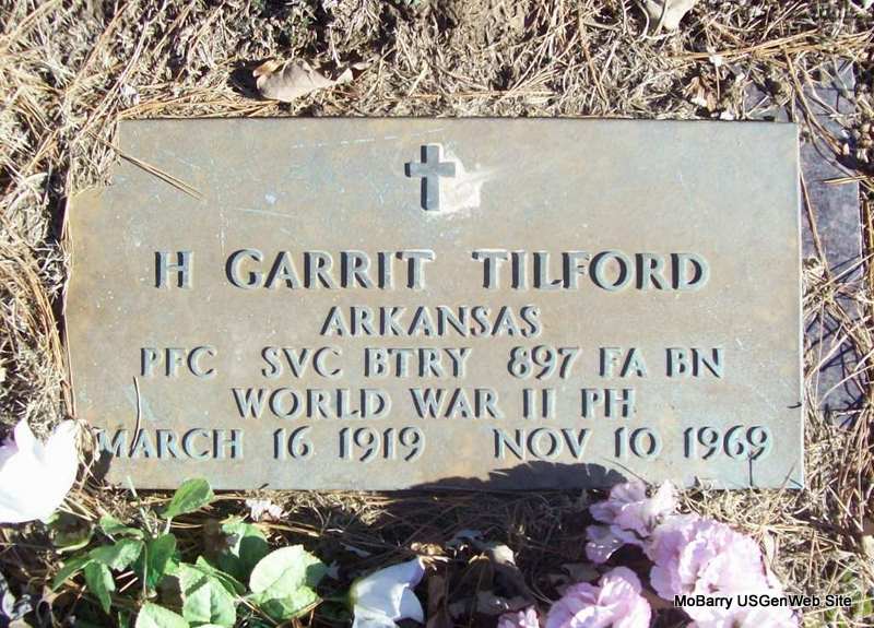 Inscription: "Arkansas PFC SVC Btry 897 FA BN - World War II - PH" - Research Note: Barry County Advertiser, Nov. 19, 1969 - Garrit Tilford, 50, Seligman, MO, died Monday, Nov. 10, 1969 at 2:15 p.m. in the South Barry County Hospital at Cassville where he had been a patient the past three weeks. Mr. Tilford was born March 16, 1919 in Benton County, Arkansas and was a veteran of World War II. Survivors include his widow and five children, three sons and two daughters; a step-son, and one step-daughter; six brothers; three sisters; and many other relatives. Services were held at 1:30 p.m. Nov. 14th at Culvers Funeral Home. Burial was at Gateway Cemetery, Gateway, Arkansas. - Son of Marcus Lafayette Tilford and Rosa E. Douglas. Hazen Garrit Tilford, age 22, married Maggie Starkey, age 16, on May 5, 1941 in Benton Co., AR. Hazen G. Tilford, age 27, married Betty Lou Loyd, age 18, on July 31, 1946 in Benton Co., AR. His surviving wife on the death certificate was Mae Snawder and she was the informant. Usual residence was Seligman, Barry Co., MO. - WW II Veteran: Enlisted in the service on Apr. 1, 1942 and released on Oct. 19, 1945. | Obit Photo Wilma Fields Census AR Marriage Index Veteran Burials Death Certificate Phyllis Long |