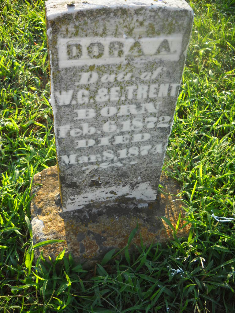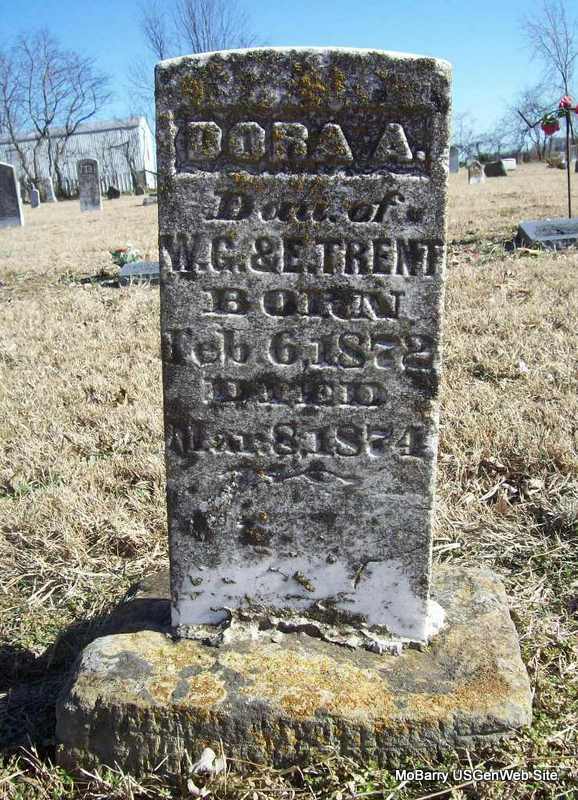 | TRENT, Dora A. | Feb. 6, 1872 | Mar. 8, 1874 | Inscription: "Daughter of W. G. and E. Trent" - Research Note: Ellender Roller and Willis G. Trent married in Barry County, MO, on Feb. 26, 1871. - Photo Retake | Photo Wilma Fields Note Donna Cooper Retake Photo Donna Cooper Ted Roller |