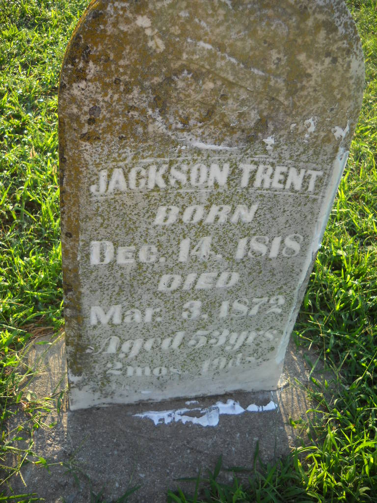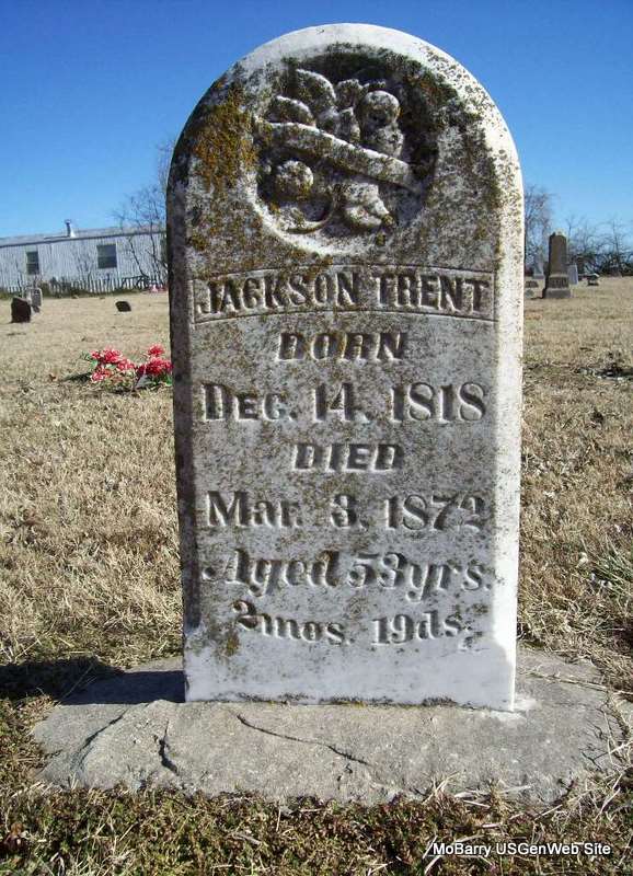 Mar. 3, 1872 | Inscription: "Aged 53 yrs., 2 mos., 19 ds." - Research Note: He married Liza Ann Jobe in Morgan Co., IN, May 3, 1846. His father was named William Trent. In 1870 he and Liza were living in Sugar Creek Twp., of Barry Co., MO, and he was age 51 and she was 43. He was born in VA and she was born in KY. - Photo Retake | Photo Wilma Fields Note Donna Cooper Retake Photo Donna Cooper Ted Roller |