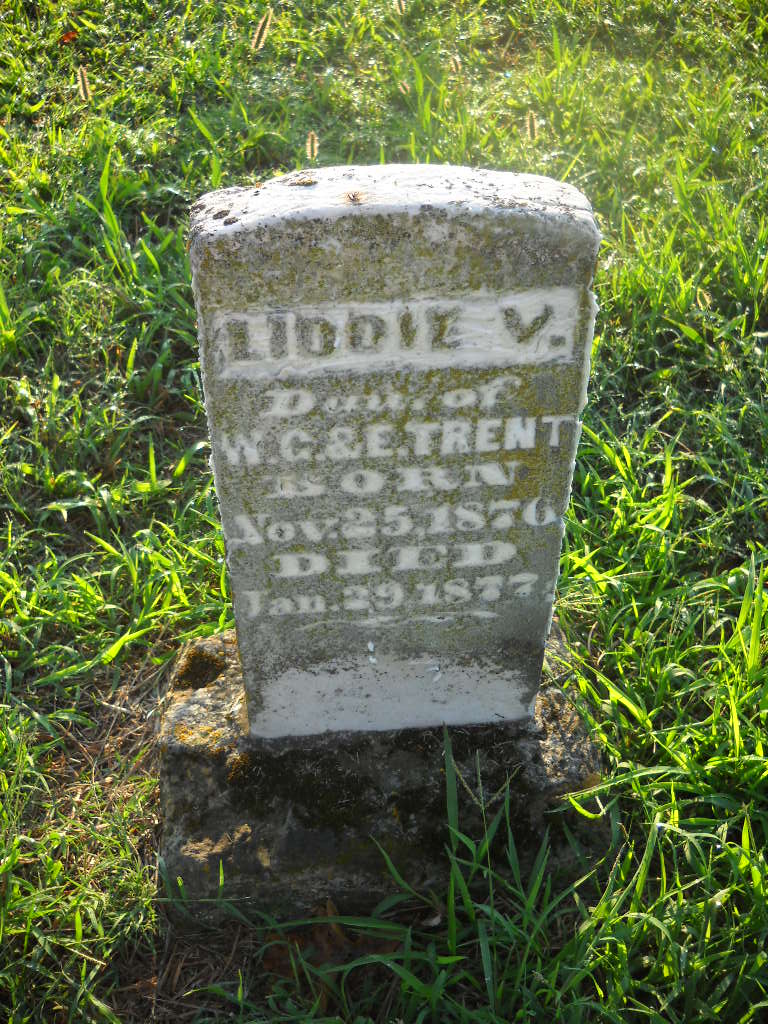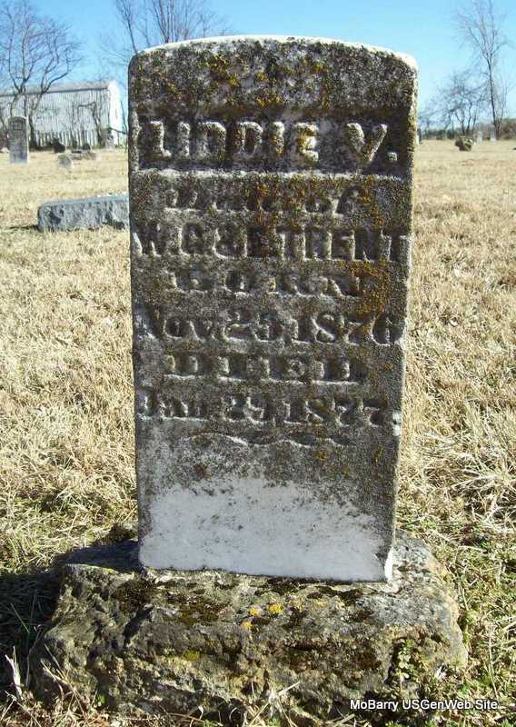 | TRENT, Liddie V. | Nov. 25, 1876 | Jan. 29, 1877 | Inscription: "Daughter of W. G. and E. Trent" - Research Note: Daughter of Willis Gorman Trent and Elender Roller Trent. Ellender Roller and Willis G. Trent married in Barry County, MO, on Feb. 26, 1871. - Photo Retake | Photo Wilma Fields Note Donna Cooper Retake Photo Donna Cooper Ted Roller |