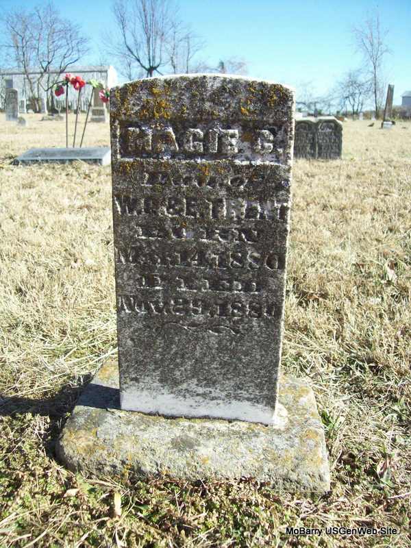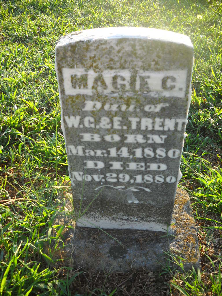 | TRENT, Magie C. | Mar. 14, 1880 | Nov. 29, 1880 | Inscription: "Daughter of W. G. and E. Trent" - Research Note: Ellender Roller and Willis G. Trent married in Barry County, MO, on Feb. 26, 1871. - Photo Retake | Photo Wilma Fields Note Donna Cooper Retake Photo Donna Cooper Ted Roller |