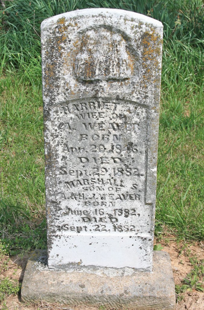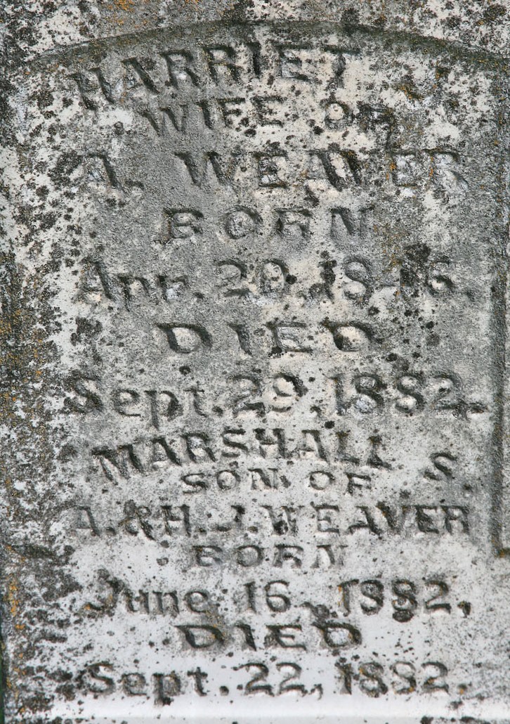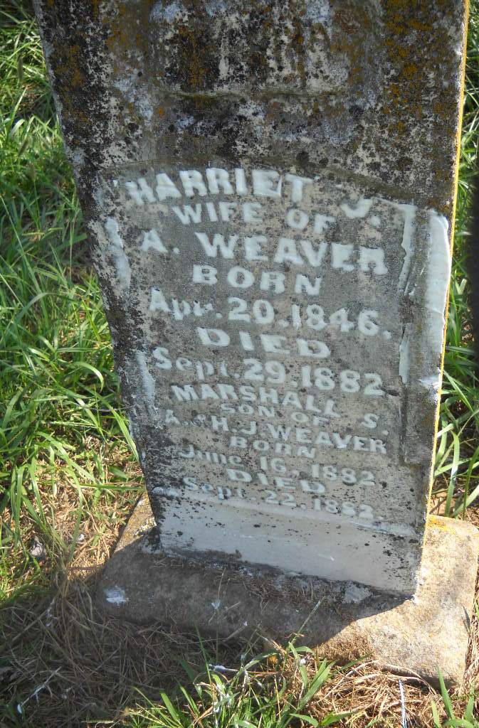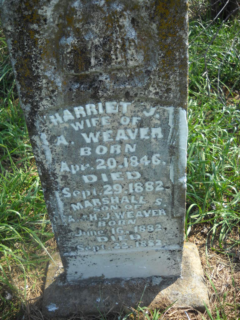 | WEAVER, Marshall S. | June 16, 1882 | Sept. 22, 1882 | SSW: Harriet J. - Inscription: "Son of A. and H. J. Weaver" - Research Note: Son of Asher Weaver and Harriet Jane Stone. - Photo Retake | Photo Wilma Fields Retake Photo Donna Cooper Ted Roller |