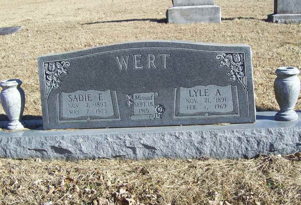 SSW: Lyle A. - Inscription: "Married Sept. 18, 1915" - Research Note: Daughter of Michael Jefferson Robinett, Jr. and Rebecca Surina Ash. Amon Wert, age 21, married Sadie Robinett, age 21, on Sept. 18, 1915 in Benton Co., AR. | Photo Wilma Fields Census AR Marriage Index Phyllis Long |