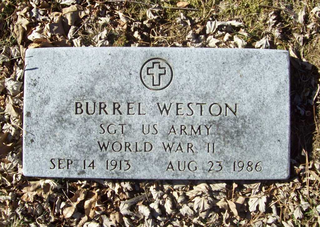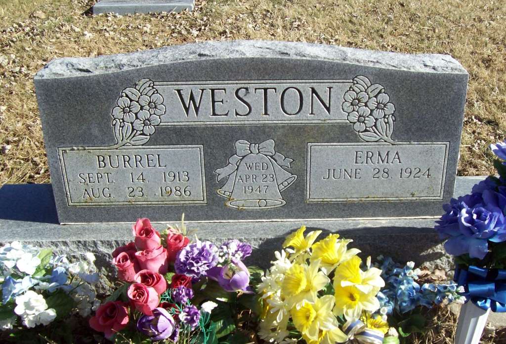 | WESTON, Burrel | Sept. 14, 1913 | Aug. 23, 1986 | SSW: Erma - Inscription: "Wed. Apr. 23, 1947" - Research Note: Son of Ertie C. Weston and Pheba Gertrude Scroggins. Burrel Weston, age 33, married Erma Lee Gaddy, age 22, on Apr. 23, 1947 in Benton Co., AR. - Military Stone - Inscription: "Sgt. US Army World War II" | Photo Wilma Fields AR Marriage Index Census Phyllis Long |