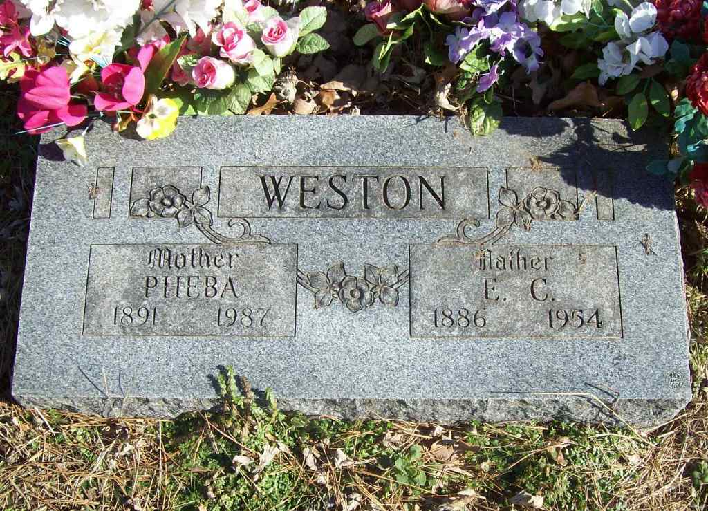 1954 | SSW: Pheba - Inscription: "Father" - Research Note: E. C. Weston is Ertie C. Weston and he was a son of John Wesley and Phoebe (England) Weston. In 1900 he was listed in the household of his mother and father in Carroll Co., Arkansas. His wife was Pheba Scroggins. | Photo Wilma Fields Note David Weston |