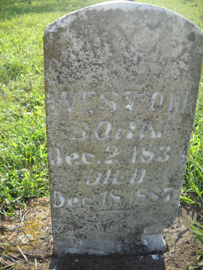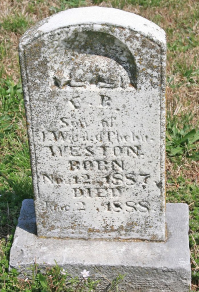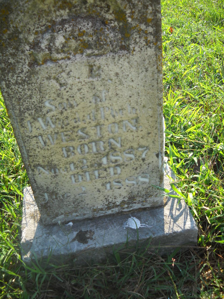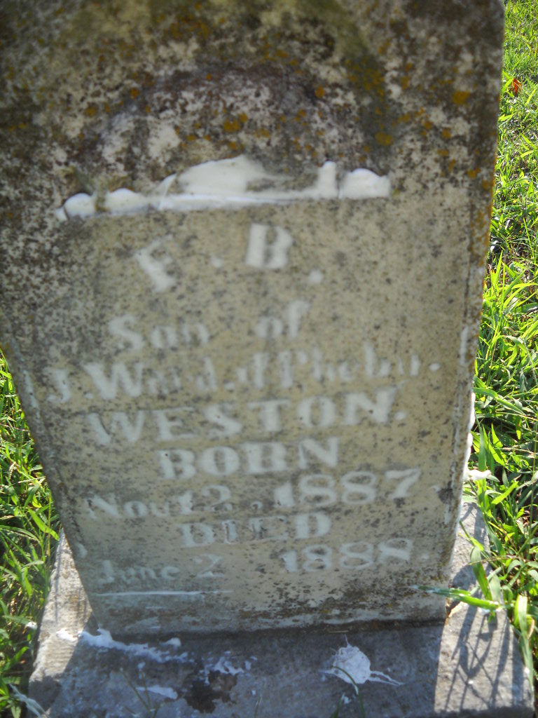 | WESTON, F. B. | Nov. 12, 1887 | June 2, 1888 | Inscription: "Son of J. W. and Pheby Weston" - Research Note: Son of John Wesley Weston and Phoebe England. - Retake Photo - Retake Photo - Retake Photo | Photo Wilma Fields Retake Photo Donna Cooper Ted Roller |