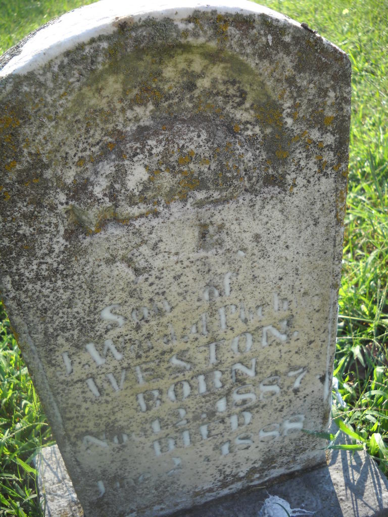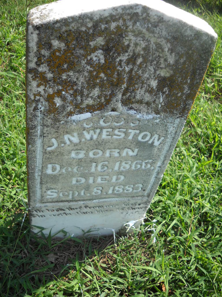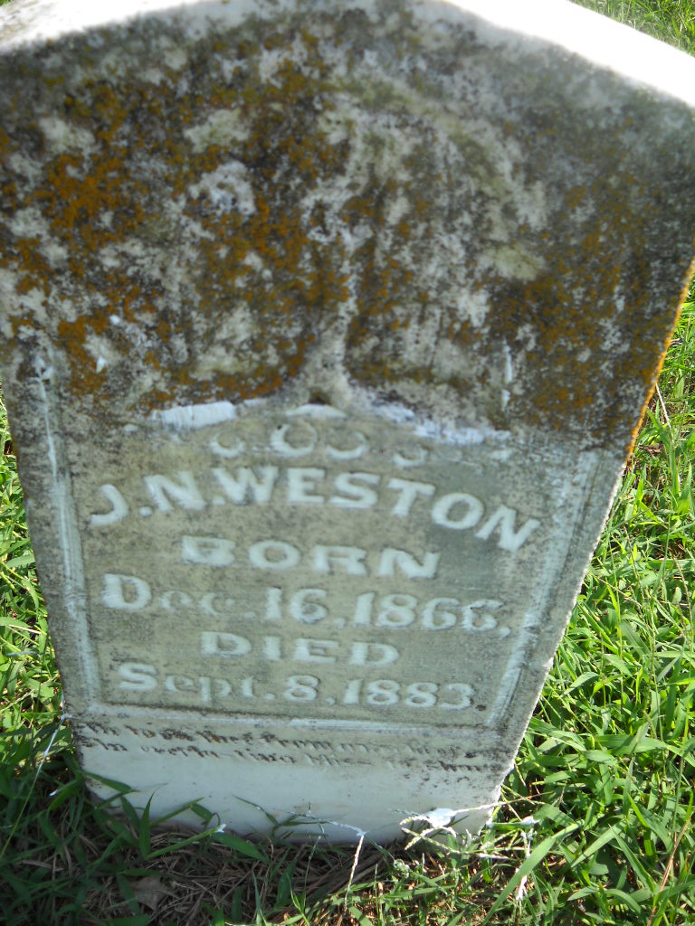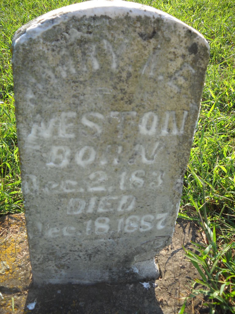 | WESTON, Isaac Newton | July 23, 1875 | Oct. 12, 1875 | Inscription: "Isaac N. - Son of S. S. and Polly" - Research Note: Part of this stone is missing. Son of Simon Sephus Weston and Mary Ann Herd. - Another Photo - Retake Photo | Photo Wilma Fields Note Donna Cooper Retake Photo Donna Cooper Ted Roller |
