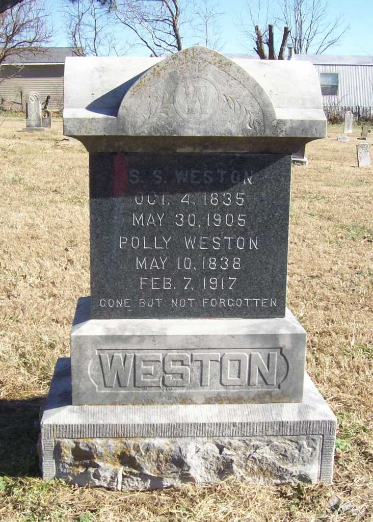 | WESTON, Simon Sephus | Oct. 4, 1835 | May 30, 1905 | SSW: Polly - Research Note: Son of John Weston and Elizabeth Babb. Simon Sephus Weston married Mary Ann Herd, in Seligman, MO, Jan. 22, 1857. His stone has S. S. on it and not his full name. Simon and Polly were listed in Sugar Creek Twp., in 1880, and living with them was his divorced father, James, who was age 70 and born in TN. James reported both of his parents as born in PA. |