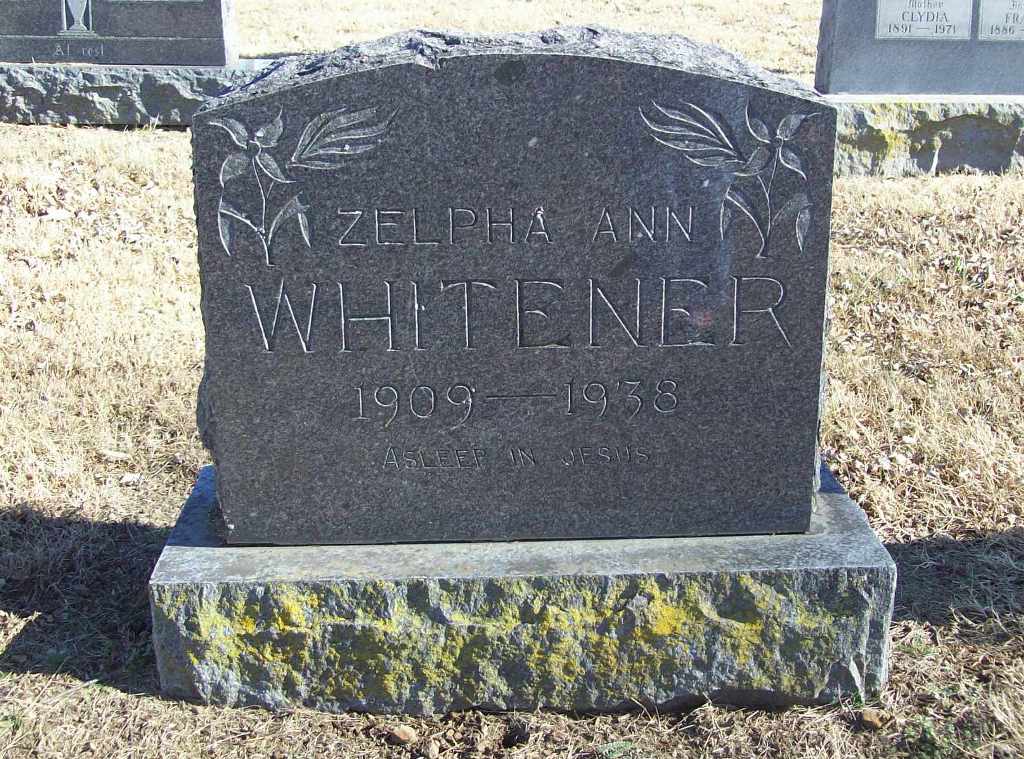 | WHITENER, Zelpha Ann (WYRICK) | 1909 | 1938 | Inscription: "Asleep in Jesus" - Research Note: Wife of Jethero Gurden Whitener. Daughter of James Adam Wyrick and Nancy Caroline Rice. | Photo Wilma Fields Census Phyllis Long |