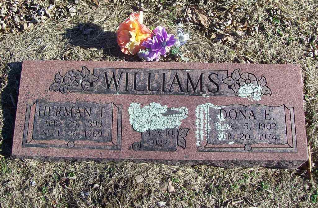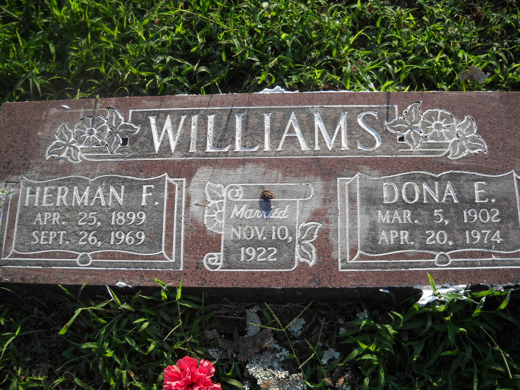 | WILLIAMS, Herman Franklin | Apr. 25, 1899 | Sept. 26, 1969 | SSW: Dona E. - Inscription: "Married Nov. 10, 1922" - Research Note: Son of William Dennis Williams and Mary Frances Wyrick. - Photo Retake | Photo Wilma Fields Retake Photo Donna Cooper Ted Roller Census Phyllis Long |
