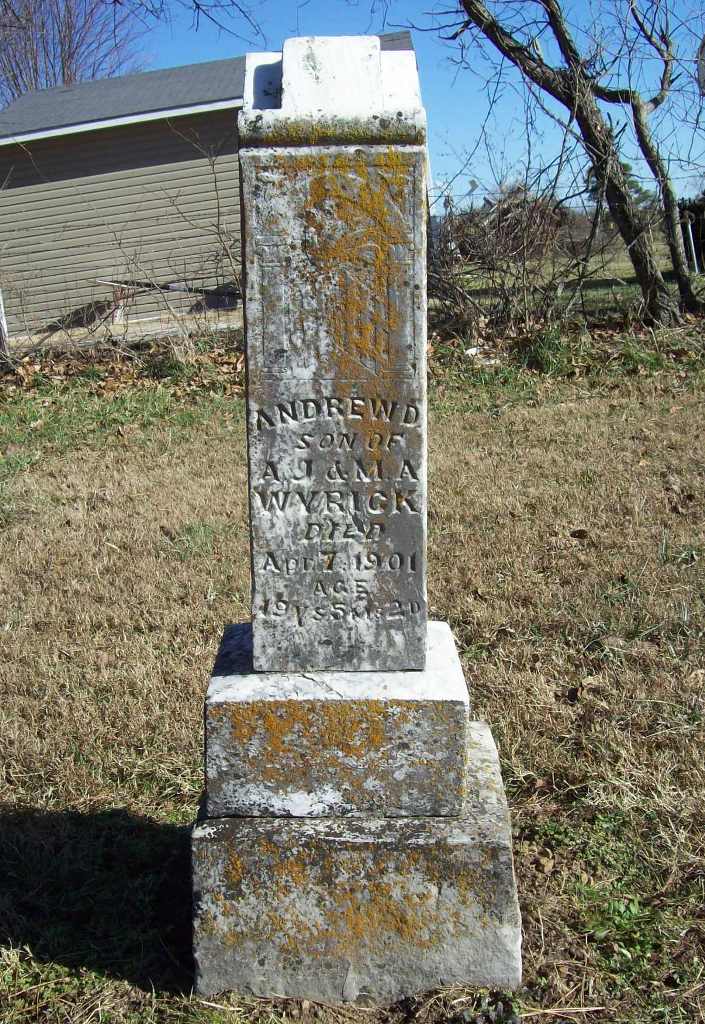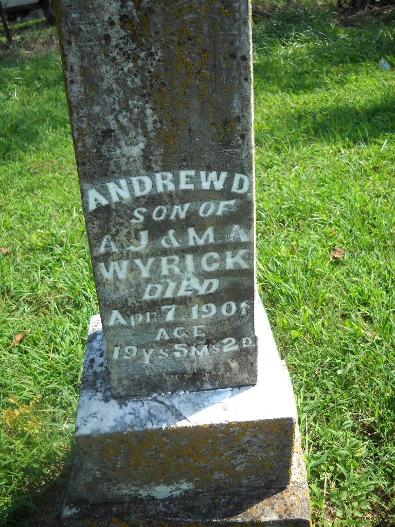 | WYRICK, Andrew Dallas | 1882 | Apr. 7, 1901 | Inscription: "Son of A. J. and M. A. Wyrick Age 19 Ys. 5 Ms. 2 D." - Research Note: Son of Andrew Jackson Wyrick and Mary Ann Phipps. - Retake Photo | Photo Wilma Fields Retake Photo Donna Cooper Ted Roller Census Phyllis Long |