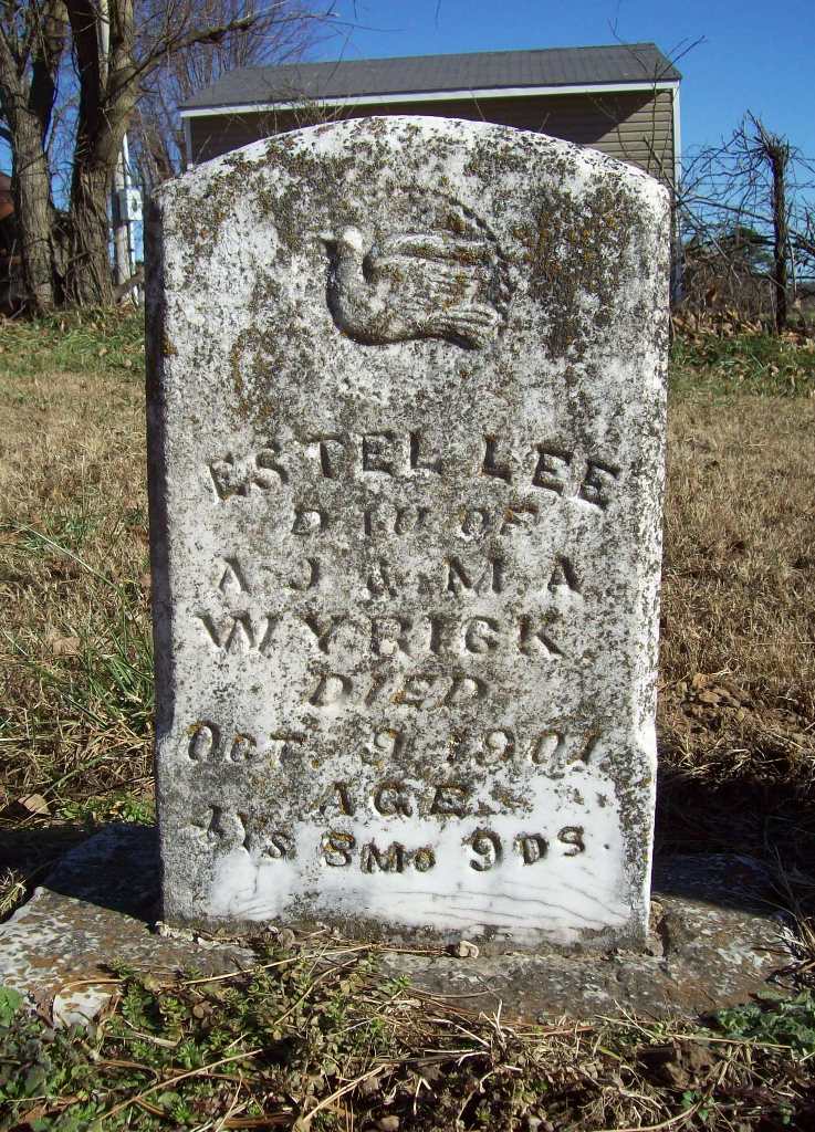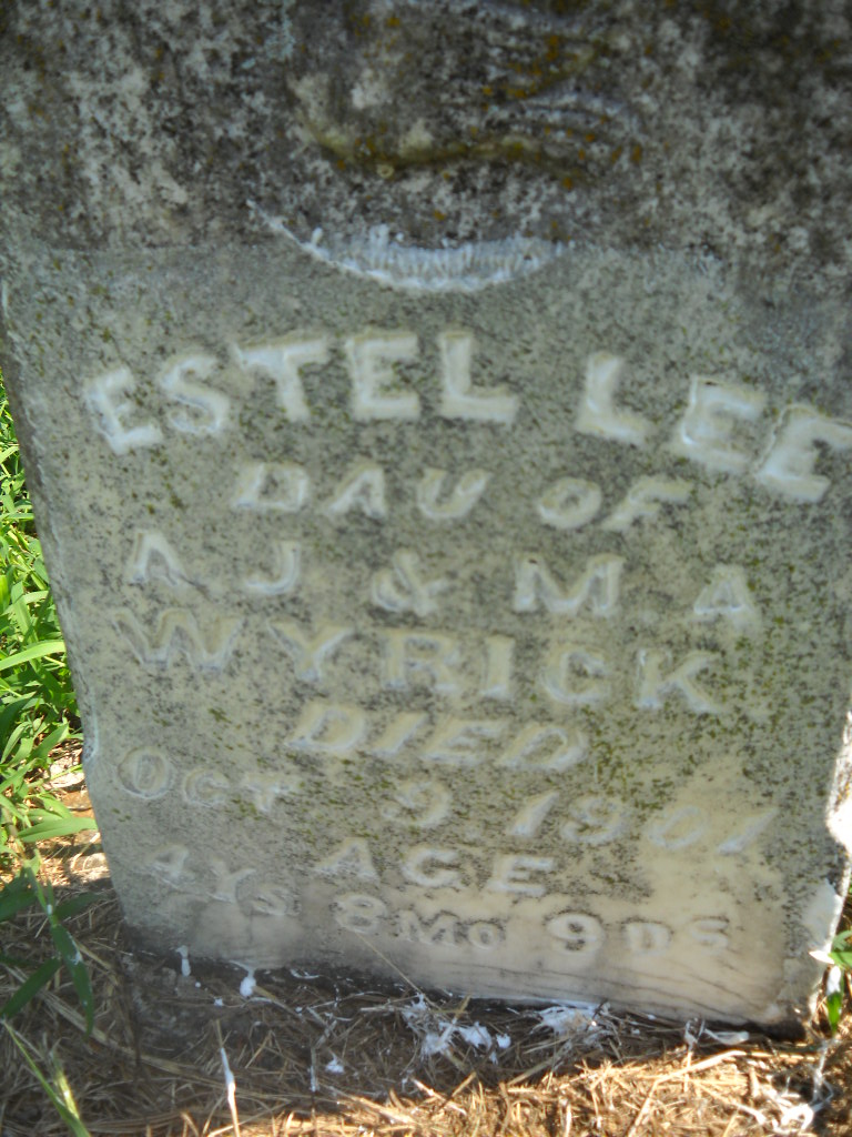 | WYRICK, Estel Lee | Abt. 1896 | Oct. 9, 1901 | Inscription: "Dau. of A. J. and M. A. Wyrick - Age 4 Ys. 8 Mo. 9 Ds." - Research Note: Daughter of Andrew Jackson Wyrick and Mary Ann Phipps. - Retake Photo | Photo Wilma Fields Retake Photo Donna Cooper Ted Roller Census Phyllis Long |