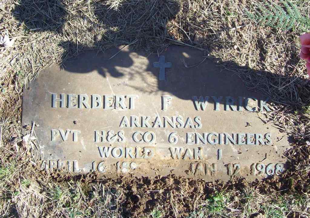| WYRICK, Herbert Franklin | Apr. 16, 1899 | Jan. 12, 1968 | Inscription: "Arkansas - Pvt. H and S Co. 6 Engineers - World War I" - Research Note: Son of James A. Wyrick and Nancy C. Rice. He was listed in 1930 as a son of James A. and Nancy Caroline Wyrick. | Photo Wilma Fields Census Note Donna Cooper SS Claims Index Phyllis Long |
