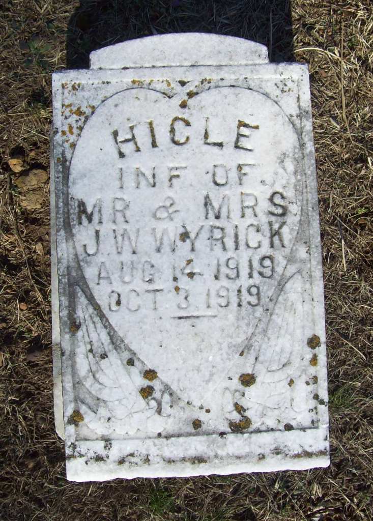 | WYRICK, Hicle | Aug. 14, 1919 | Oct. 3, 1919 | Inscription: "Inf. of Mr. and Mrs. J. W. Wyrick" - Research Note: This stone is off its base and flat on the ground. It needs repair. It is still readable but won't be long if it lays face up like it is. | Photo Wilma Fields Note Donna Cooper |