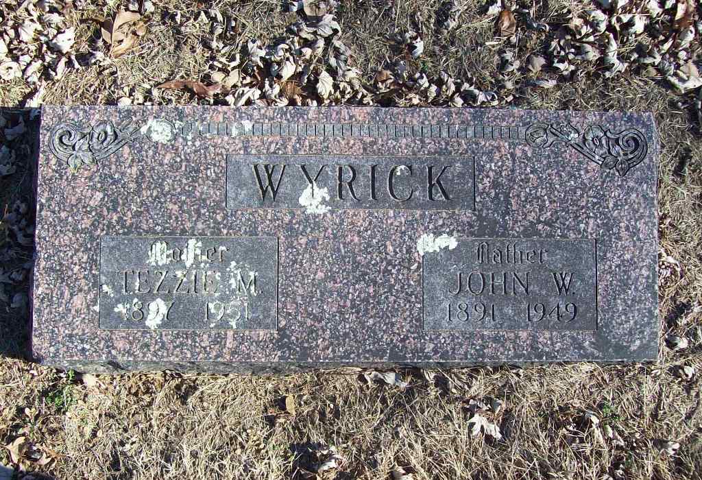 SSW: Tezzie M. - Inscription: "Father" - Research Note: Culver's Funeral Home records read that his father was Andrew Wyrick and his mother Mary Ann Phipps. The cause of death was acute supperative appendicitis. He was a farmer and married. Tezzie Wyrick was given as his wife's name. On his death certificate Mrs. Tezzie Wyrick was the informant. His usual address was Garfield, Benton Co., Arkansas. - Photo Retake | Photo Wilma Fields Culver's Funeral Home Records, V. 3, P. 127 By Ted Roller Death Certificate Donna Cooper Retake Photo Donna Cooper Ted Roller |