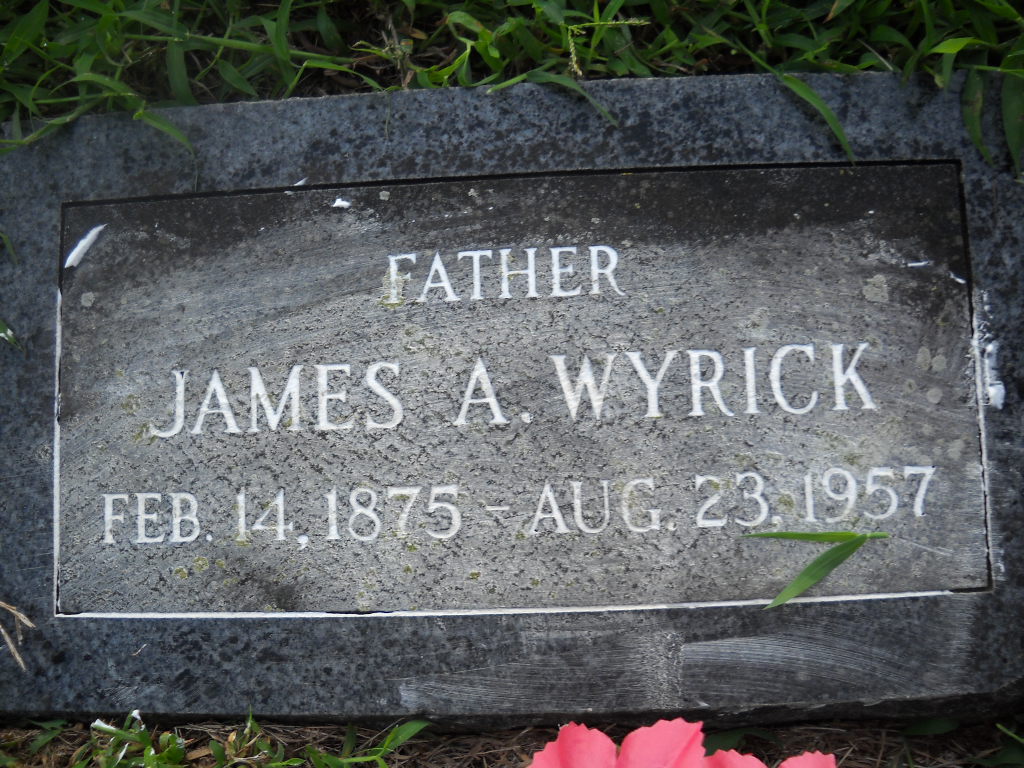 Aug. 23, 1957 | Inscription: "Father" - Research Note: Son of Andrew Jackson Wyrick and Mary Ann Phipps. Adam Wyrick, age 20, married Caroline Rice, age 20, on Nov. 30, 1895 in Barry Co., MO. He was appointed Postmaster on Dec. 13, 1912 in Busch, Carroll Co., AR. In 1930, James A. Wyrick was listed as born in AR, about 1875 in Beaver, Carroll Co., AR, with wife, Nancy C., age 55. Children in the household were Herbert, age 30, Zelpha, age 21, and Allen, age 19. - Photo Retake | Photo Wilma Fields Census Note Retake Photo Donna Cooper Ted Roller MO Marriage Records Census Postal Appointments Phyllis Long |