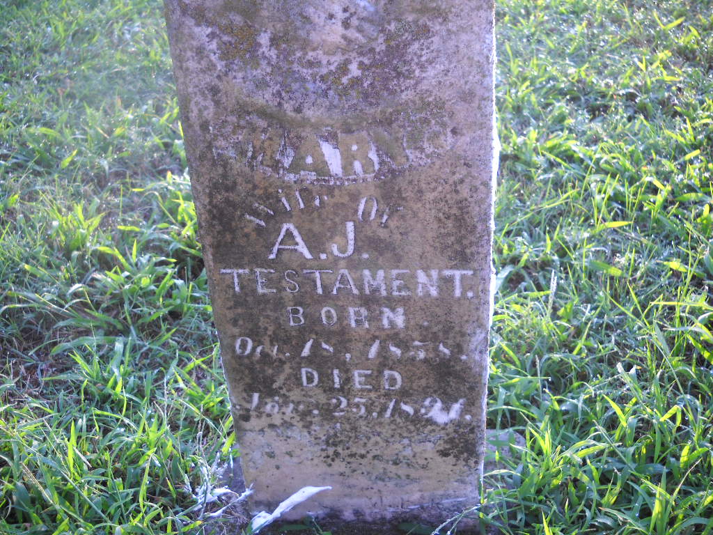 Nov. 25, 1891 | Inscription: "Wife of A. J. Testament" - Research Note: In 1880 Andrew and Mary Testament were living in Jonesville, Lee Co., VA, and he was listed as age 25, born TN, unable to work, she was age 22, born VA, and their son, Milan, was age 6, born in VA, their daughter, Lulu, was age 3, born VA. - Photo Retake | Photo Wilma Fields Note Donna Cooper Retake Photo Donna Cooper Ted Roller |
