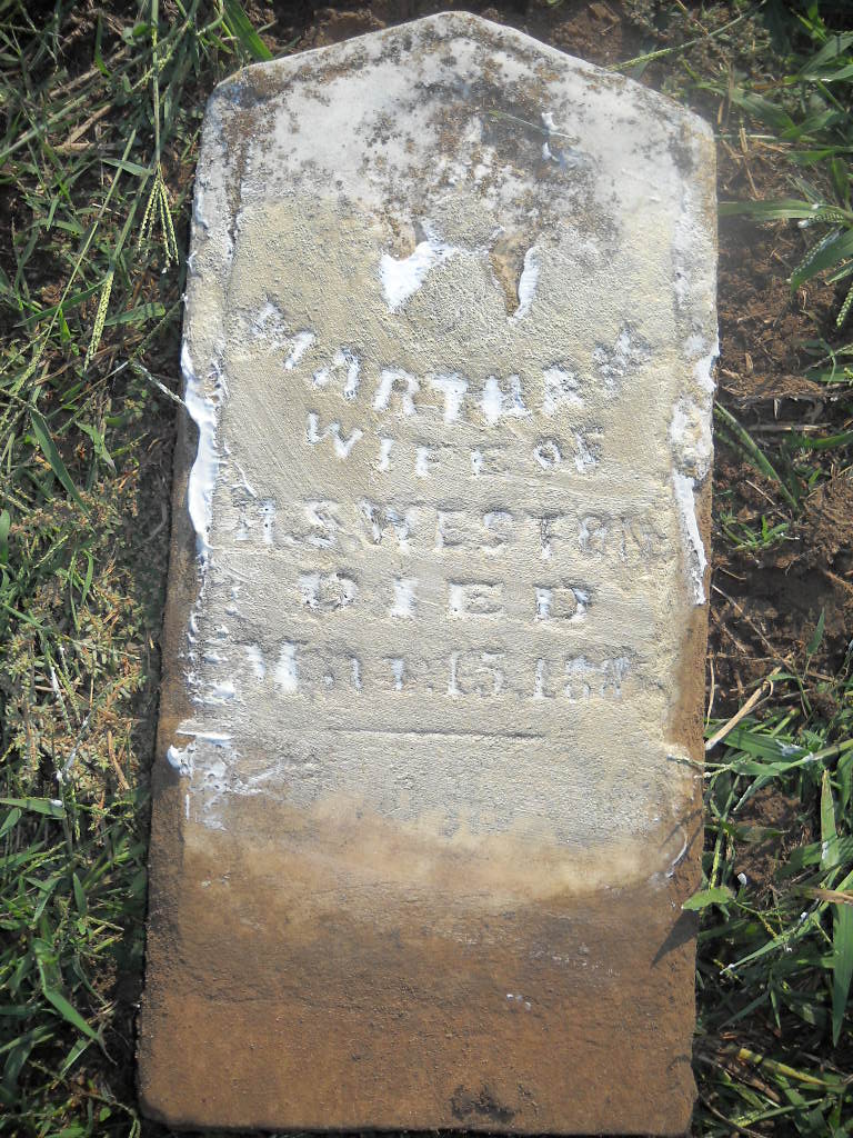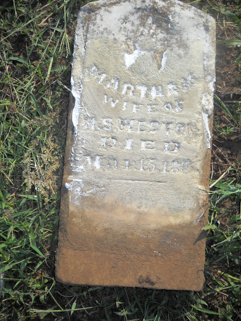 Inscription: "Wife of H. S. Weston" - Research Note: This stone is flat on the ground and needs to be replaced. Martha was married to Harvy Sevier Weston and was a daughter of John Samuel and Jane (King) Weston. After she died Harvey married Rutha Jane Weston in Barry County on Sept. 13, 1885. - Retake Photo - Retake Photo | Photo Wilma Fields Note Donna Cooper Retake Photos Donna Cooper Ted Roller |