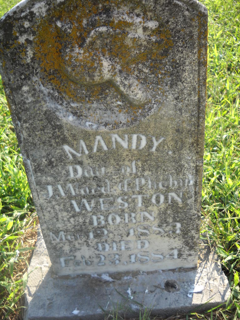 | WESTON, Mandy | Mar. 12, 1883 | Feb. 23, 1884 | Inscription: "Dau. of J. W. and Pheby Weston" - Research Note: Daughter of John Wesley Weston and Phoebe England. - Retake Photo | Photo Wilma Fields Retake Photo Donna Cooper Ted Roller |