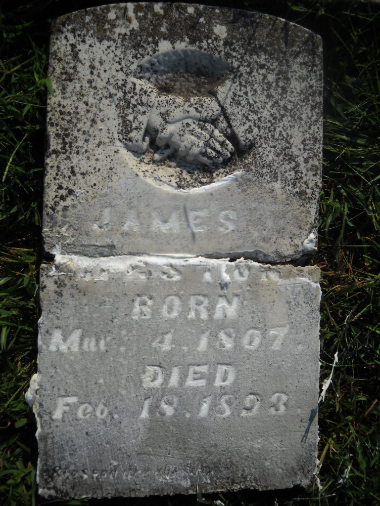 Research Note: This stone beyond repair and needs to be replaced. It is broken in two pieces and off its base. James married Elizabeth Babb in March of 1827 in Hawkins Co., TN. - Retake Photo - Retake Photo - Another Photo | Photo Wilma Fields Note Donna Cooper Retake Photo Donna Cooper Ted Roller New Stone Photo David Weston |