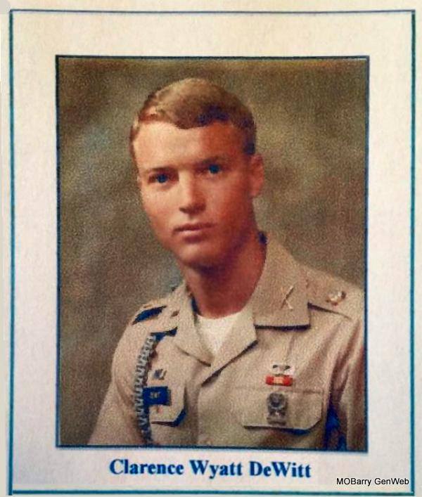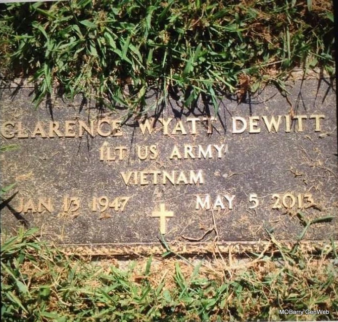 Research Note: C. W. graduated from Hobbs High School in 1965. He received his Bachelor of Science in Landscape Architecture with honors from Texas Tech University in 1969. He was an officer in the U. S. Army, 173rd Airborne Brigade where he served from 1969-1976, and in Vietnam from 1970-1971. He owned Natures Way Wholesale Nursery in Albuquerque where he lived for 35 years before moving back to Hobbs where he owned Southwest Pilot Car. He preceded in death by his father, Virgil. He is survived by his mother, Lois (Lawson) DeWitt, from Hobbs, three daughters and one son, four granddaughters, two grandsons, a sister, three nieces, two nephews, two great nieces, a great nephew, plus many more aunts, uncles, and cousins. - Carolynn's Note: As you walk into Roller Cemetery he is in about the third row on the left side between Bert and Dolly DeWitt and J. C. And Wanda Tipton. He wanted to be in the sun not under the trees. Daddy picked out the site. - Photo of Clarence Wyatt - Military Stone - Inscription: "1LT, US Army, VIETNAM" | Obit Photos Carolynn (DeWitt) Ainsworth |