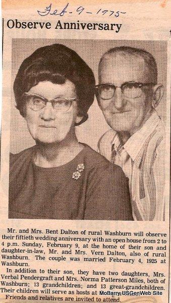 Research Note: Son of Elias Presley Dalton born Clay Co., IN and Mary Ellen Gregg born MO. Husband of Lona Elizabeth Day. - Bent "Doc" Dalton, 88, Washburn, died at 8:15 p.m. at South Barry Co. Hospital after a long illness. He was born in Washburn, Oct. 14, 1900. He was a retired farmer. He married Lona Elizabeth Day on Feb. 4, 1925, in Washburn. Survivors include one son and two daughters; 13 grandchildren; 22 great grandchildren; and 26 great great grandchildren. - Photo of Bent and Lona | Headstone Delta Newby Obit Census Phyllis Long |