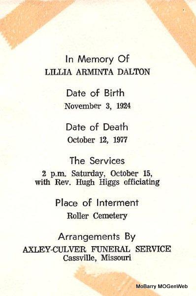 | DALTON, Lillie Arminta | Nov. 3, 1924 Barry Co., MO |