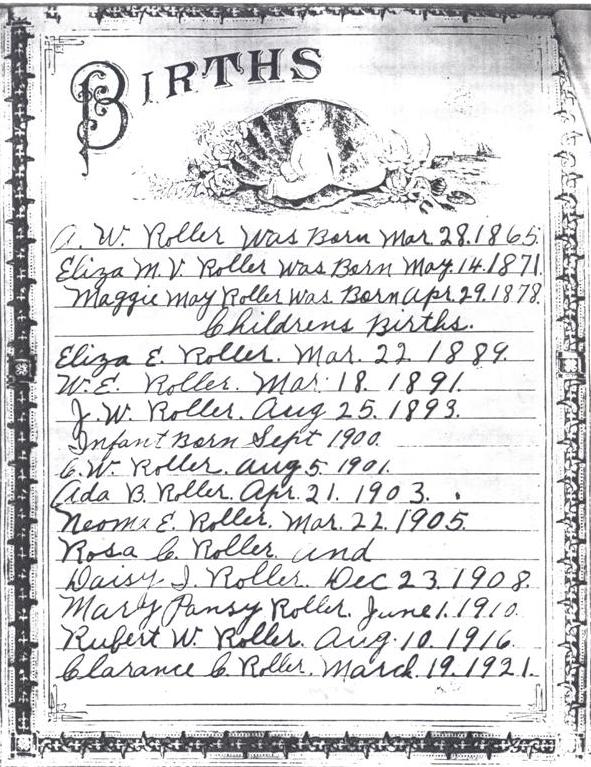 Page 1 James Alexander Roller July 30, 185? John Franklin Roller Sept. 14, 1859 Delilah Ann Roller Nov. 14, 1861 Mahala Caroline Roller Feb. 28, 1864 Andrew Washington Roller March 28, 186? (possibly a 5) Nancy Neomia Roller May 25, 1868 Jacob Wesley Roller Dec. 26 187? Jasper Marion Roller Nov 23 1872 William Jefferson Roller Mar. 4, 1876 Charles Frederick Roller Apr. 23, 1878 Francis Walter Roller July 26, 1880 Deaths John Franklin Roller Oct. 6, 1862 Page 2 Great Grand Father Robinette's Family came from Scott County, Virginia Birth Death Micheal Robinette I Apr. 26, 1806 Oct. 10, 1887 Polly Robinette Mar. 1, 1815 Nov. 23, 1892 To this union were born: children Birth Death Phoebe Robinette Nov. 16, 1835 Nov. 1895 George Robinette Aug. 16 1837 1861 or 1865 William Robinette Feb. 28, 1839 Dec. 23, 1860 Ruhama Robinette Aug. 1, 1840 May 1909 Andrew Robinette Mar. 5, 1852 Apr. 12, 1863 Hezekish Robinette Jan. 9, 1844 Nov. 13, 1844 Lewis Robinette Sept. 12, 1845 Feb. 7, 1872 Stephen Robinette May 28, 1847 Sept. 1928 Micheal Robinette II July 13, 1849 Sept. 3, 1914 (my grandfather) John Robinette July 23, 1851 Apr 23, 1925 Julia Robinette Jan. 28, 1853 Mar. 26, 1947 Mary Robinette Mar. 16, 1855 Mar. 11, 1895 Jack Robinette no date no date Page 3 John Robinette July 23, 1851 Apr 22, 1925 (maiden name Forgey) Elender (Robinette) Nov. 9, 1857 Apr. 30, 1878 To this union was born: Effie Jane Robinette (???) Mar. 11, 1877 July 23, 1956 Maggie May Robinette (Roller) Apr. 29, 1878 Feb. 18, 1923 Second Marriage John Robinette July 23, 1851 Apr. 23, 1925 Diana Robinette May 26, 1858 Apr. 29, 1953 (maiden name Williams) Oscar Robinette Sept. 4, 1880 May 22, 1963 Charles Robinette Jan. 5, 1884 Aug. 25, 1975 Della Robinette (Shall) Mar. 29, 1885 July 10, 1949 William Willard Robinette Dec. 31, 1888 June 3, 1961 David W. Robinette May 12, 1890 Dec. 5, 1911 Micheal Robinette III May 12, 1893 Sept. 16, 1982 James A. Robinette Dec. 11, 1869 1898 (Jewel) Etta May Robinette (Martin) May 3, 1898 Jan. 1946 Page 4 Jacob Roller May ??, 1802 (date not visible) (my great grandmother) (my great grandmother) Patsy Roller Apr. 1, 1807 Dec. 8, 1844 Catherine Roller Apr. 22, 1852 she died at the age of about ??? Mary J. Roller Mar. ?, 1829 Oct. 27, 1895 Children Birth Death John Roller July 30, 1824 Apr. 6, 1895 Mary Roller Dec. 14, 1825 no date George Roller Mar. 23, 1833 no date Washington Roller Jan. 11, 1835 Nov 3, 1882 Jackson Roller Jan. 11, 1835 no date Isom Roller Nov. 16, 1836 no date (my grandfather) Jacob Roller II Sept. 18, 1838 June 28, 1882 Margrett Roller Mar. 11, 1840 Nov. 11, 1900 Elizabeth Roller Nov. 25, 1841 July 18, 1918 Nancy Roller Nov. 18, 1844 Dec. 8, 1932 Mahala Roller Sept. 15, 1845 Dec. 8, 1904 William Roller Aug. 6, 1847 Jan. 13, 1929 Ellander Roller Aug. 17, 1849 no date Hester Ann Roller Jan. 2, 1855 Dec. 26, 1917 Rebecka Roller Jan. 30, 1857 June 22, 1932 Phillip Roller Mar. 18, 1858 Nov. 19, 1934 Martha J. Roller Sept. 25, 1860 May 13, 1902 Hiram Roller Dec. 27, 1862 Oct. 1945 Cinthia Roller Mar. 2, 1865 Nov. 6, 1930 Page 5 Jacob Roller II died June 28, 1882 maiden name Arnhart Catherine Roller Born. Jan. 11, 1839 Died. Jan. 19, 1923 Children (born in McDonald Co Missouri) James Alexander Roller July 30, 1857 Dec. 1, 1939 John Franklin Roller Sept. 14, 1859 Oct. 6, 1862 Delilah Ann Roller (Clanton) Nov. 14, 1861 Dec. 11, 1939 Mahala Caroline Roller (Fawver) Feb. 28, 1865 Jan. 19, 1947 Andrew Washington Roller Mar. 28, 1865 Sept. 1, 1946 Nancy Naomi Roller (Clem) May 25, 1868 Mar. 1, 1952 Jacob Wesley Roller III Dec. 26, 1870 Mar. 26, 1952 Jasper Marion Roller Nov. 23, 1872 Jan. 13, 1951 William Jefferson Roller Mar. 4, 1876 Oct. 29, 1958 Charles Fredrick Roller Apr. 23, 1878 June 12, 1904 Francis Walter Roller July 2, 1880 A. W. Roller's Bible - Page 7 Births A. W. Roller was born Mar. 28, 1865 Eliza M. V. Roller was born May 14, 1871 Maggie May Roller was born Apr. 29, 1878 Childrens Births Eliza E. Roller Mar. 22, 1889 W. E. Roller Mar. 18, 1891 J. W. Roller Aug. 25, 1893 Infant Sept. 1900 C. W. Roller Aug. 5, 1901 Ada B. Roller Apr. 21, 1903 Neomi E. Roller Mar. 22, 1905 Rosa C. Roller and Daisy I. Roller Dec. 23, 1908 Mary Pansy Roller June 1, 1910 Rubert W. Roller Aug. 10, 1916 Clarance C. Roller March 19, 1921 Page 8 What therefore God hath joined together let not man put asunder This is to certify That A. W. Roller and E. M. V. Murphy were united in the bonds of Holy Matrimony at in the home of Benton on the 12 day of February in the year of our Lord 1888 in the Presence of ______ Signed Spencer B. Ford Page 9 Marriages This certifies that A. W. Roller of Herd State of Arkansas and Maggie Robinett of Herd State of Arkansas were united in Holy Matrimony at James Bakers on the 15 day of Oct. A.D. 1899 in the presence of James Baker and wife by F. M. Clanton Minister of the Gospel Note Page Andrew Washington Roller (Mar. 28, 1865 – Sept. 1, 1946) 1# Malisa Wictora Murphy 2# Maggie May Robinette buried (sic) at Gateway, Arkansas Nancy Neoma Roller (May 25, 1868; -Mar. 1, 1952) C. C. Clem burried (sic) at Vici, Okla Jacob Wesley Roller (Dec. 26, 1870 - Mar. 26, 1952) 1# Julia Harrot Barnes married ? 28, 1892 2# Laura S???? Roller's Family cemetery north of Seligman Jasper Marion Roller ( Nov. 23, 1872 – Jan. 13, 1951 Malita Ash burried (sic) at Gateway William Jefferson Roller (Mar. 4, 1876 – Oct. 29, 1959 Nora Weston Pendergraft Family Cemetery south east of Seligman, MO Note Page Grandfathers Family Jacob Roller (Aug 26, 1838 – June 28, 1882) age 44 years, 10 months, 2 days burried (sic) at Gateway Arkansas Catherine Roller (Jan. 11 1839 – Jan. 11, 1923 Arnhart James Alexander R. (July 30, 1857 – Dec. 1, 1939) Polly Ann Edens burried (sic) at P.E. Roller Cemetry (sic) John Franklin Roller (Sept. 14, 1859 – Oct. 6, 1862) burried (sic) at Roller 13 miles west of Washburn MO Deliah Ann Roller (Nov. 11, 1861 – Dec. 11, 1939) Francis Marion Clanton Family Cemetry (sic) Ea