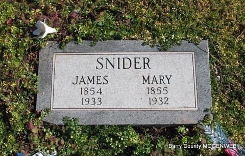 | SNIDER, Mary Josephine (MOORE) | 1855 | 1932 | SSW: James Madison - Research Note: James Snider married Mary Josephine Moore on Dec. 17, 1876 in Barry Co., MO. Daughter of Samuel T. Moore and Rebecca Caroline Wilson. | Headstone Lanny and Mary Homesley Photo Jack Fly MO Marriage Records Census Phyllis Long |