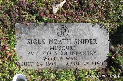 | SNIDER, Sigle Neath/Nathaniel | July 22, 1893 | Apr. 27, 1960 | Inscription: "SIGLE NEATH SNIDER - MISSOURI - Pvt. Co. A. 20 Inf. WWI" - Research Note: Son of James Madison Snider and Mary Josephine Moore. His wife was Sarah Luella Stockton. Raymond Glen Snider (son) of Jenkins, MO ordered his military stone. | Headstone Lanny and Mary Homesley Photo Jack Fly Headstone Applications Census Phyllis Long |