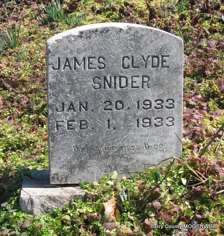 | SNIDER, James Clyde | Jan. 20, 1933 | Feb. 1, 1933 | Research Note: Son of Sigle Nathaniel Snider and Sarah Louella Stockton. | Headstone Lanny and Mary Homesley Photo Jack Fly |