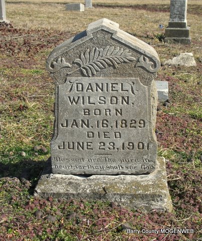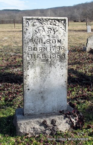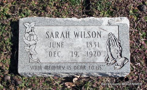 | WILSON, Sarah (EDEN) | June 1831 | Dec. 19, 1920 | Inscription: "Your Memory Is Dear To Us" - Research Note: Sarah Eden married Daniel Wilson on Jan. 3, 1850 in Barry Co., MO. | Headstone Lanny and Mary Homesley Photo Jack Fly MO Marriage Records Phyllis Long |