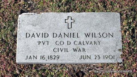 June 23, 1901 | Inscription: "PVT Co D Calvary" - Civil War Stone" - Research Note: Son of George Wilson and Mary Pauline Moore listed on this page. His wife was Sarah Eden. 1890 Vet Census gives his residence as Jenkins, Barry Co., MO and that he was injured by a falling horse during the war. This is a replacement for original stone. - Another Stone | Headstone Lanny and Mary Homesley Photos Jack Fly Census Phyllis Long |