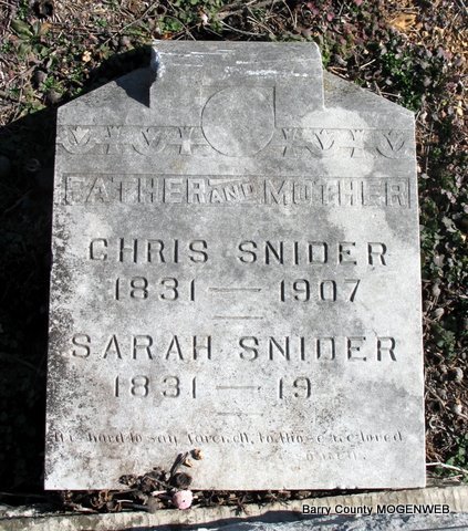 SSW: Sarah - Inscription: "Father" - Research Note: Civil War Veteran. Chris and Sarah's stone is off base and flat on the ground. Christopher Snider married Sarah Wilson on Feb. 9, 1851 in Barry Co., MO. He filed for his CW Pension on July 21, 1890 and Sarah filed for her widow's pension on May 3, 1907. - June 15, 1907, Saturday, Cassville Democrat - The heirs of the late Christopher Snider have amicably divided the estate of their father, John C. Snider purchased nearly all the shares in two farms, amounting to 330 acres. J. A. Brooks purchased the Geo. Snider farm near Cato, for $1,800. Bud Snider secured the 45 acres on Flat Creek, and Jas. Snider a 135 acre farm on White River. We are glad to see them adjusting their affairs so nicely without law suits. - Account of Son's Murder/Suicide - Another Photo | Headstone Lanny and Mary Homesley Photos Jack Fly Online Newspapers MO Marriage Records CW Pension Records Census Phyllis Long |
