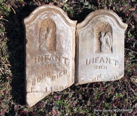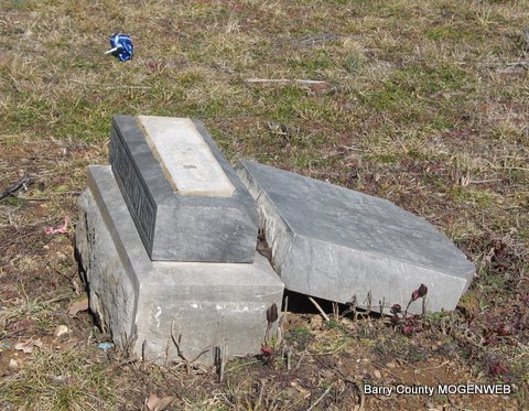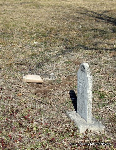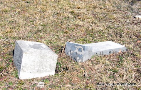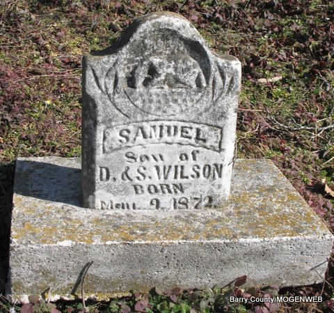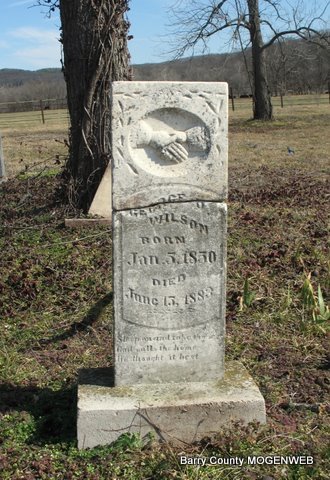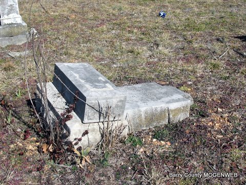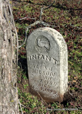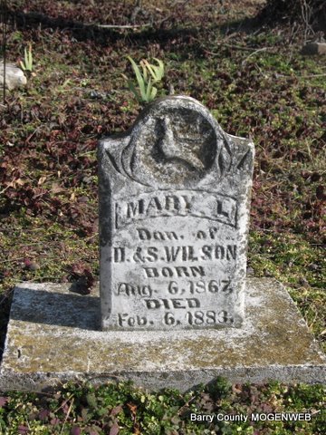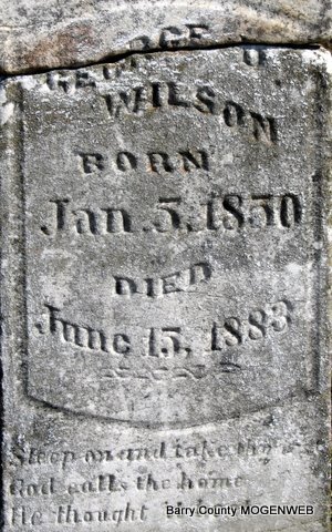 | WILSON, George Dillard | Jan. 5, 1850 | June 13, 1883 | Research Note: Son of David Daniel Wilson and Sarah Eden. His wife was Mary Jane Blythe, married on Apr. 9, 1871 in Barry Co., MO. - Stone is broken | Photos Jack Fly MO Marriage Records Census Phyllis Long |