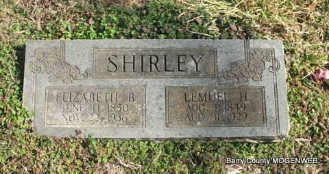 SSW: Lemuel H. Shirley - Research Note: Wife of Lemuel Shirley. The death certificate gives maiden name as Blevins and says she was an orphan. Lee Sturgil of Cato, MO was the informant. - Notes at findagrave.com by Stephanie Kelly: Elizabeth B. Blevins was born 11 Jun 1850, daughter of Thomas and Catherine (Younce) Blevins, she had a twin sister Martha. At a very young age Elizabeth's parents died in Indiana and she was considered an orphan. On Oct. 3, 1875, Elizabeth married Lemuel Hutchinson Shirley in Harrison County, Missouri where they had 7 known children, Mary, David, Daniel, Margaret, Leonard, Gertrude, George. Elizabeth and Lemuel moved from Hamilton, Harrison County, Missouri to Purdy, Barry County, Missouri around 1909 and lived there until their deaths. | Headstone Lanny and Mary Homesley Photo Jack Fly Death Certificate Phyllis Long |