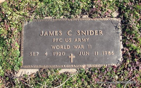 | SNIDER, James Cluster | Sept. 4, 1920 | June 11, 1986 | Inscription: "PFC US Army, WWII" - Research Note: Son of James Eddie Snider and Laura Dale Taylor. | Headstone Lanny and Mary Homesley Photo Jack Fly Census Phyllis Long |